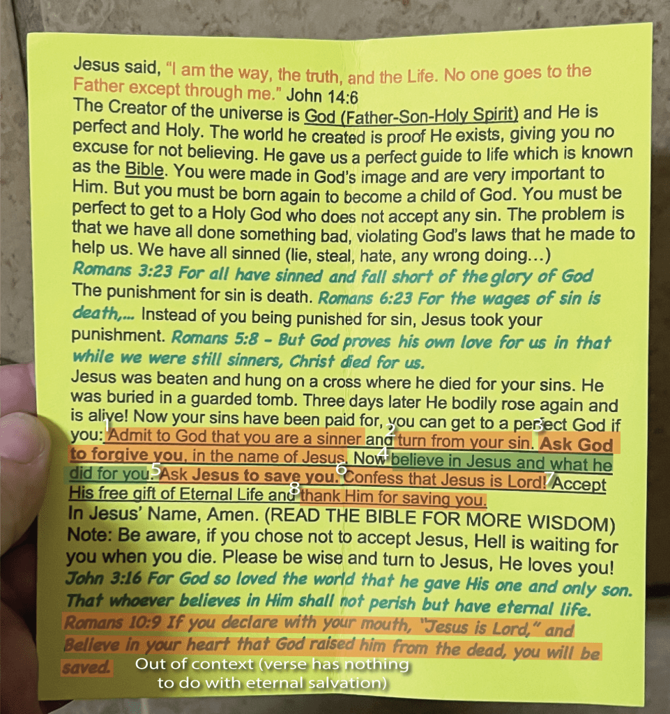 While visiting my hometown for Christmas I came across a “Gospel Tract” in the bathroom of a local store. I am all for leaving stuff in public places for people to hear the good news of Christ, so I picked it up. As someone who makes a living doing marketing and graphic design, I was a bit turned off by the look of it. Just a bunch of multicolored text on a neon green piece of paper. But I decided to read it anyways. The majority of it was solid biblical truth telling how we are all sinners in need of a savior and that Christ was that savior who would save us from our sins and offers us eternal life. It provided Bible verses to back those claims up and they were all in context and accurate. When it got to the “how to receive eternal life and forgiveness of sins” part, that is when it went off the rails. I have no doubt that this was made with the best intentions by someone who loves the Lord and wants lost people to be saved, but they obviously bought into some unbiblical doctrine that takes scripture out of context and appears to promote a works-based salvation. I decided to take a picture of this tract before I threw it in the garbage so people wouldn’t read it and be led astray. So without further ado, let’s dive in and analyze this.